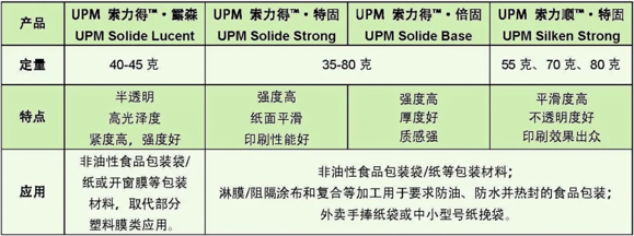 UPM目前面向市场的主要包装纸产品是索力得(UPM Solide)、索力顺(UPM Silken)白牛皮纸系列。这两款产品的研发是着眼于取代部分塑料膜类包装应用,具有可再生、可回收、可生物降解的环保优势。