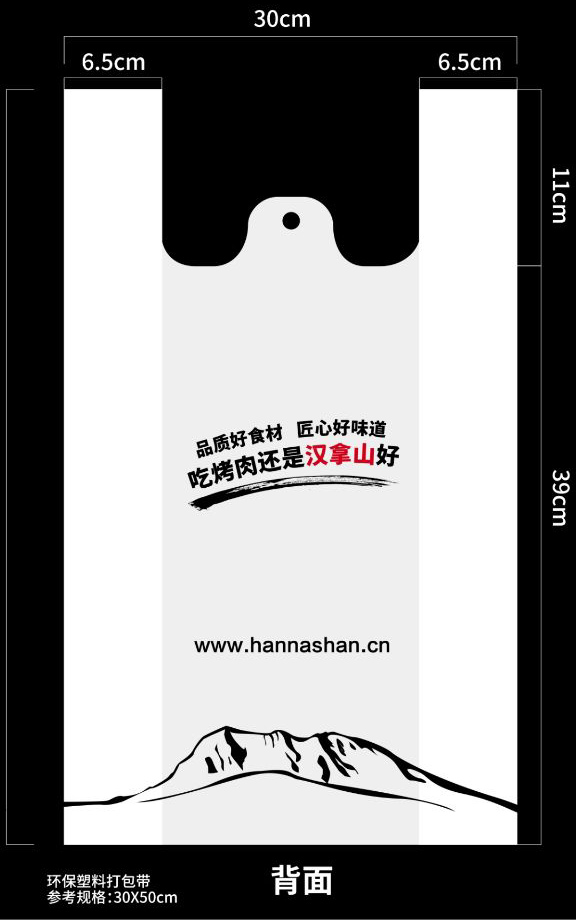 最近汉拿山生物降解背心袋选择与固特维合作,尺寸(30+6.5)*39,厚度5丝,黑红印刷,彰显汉拿山品牌特性,细腻柔软的生物降解背心袋,让顾客倍感亲切!