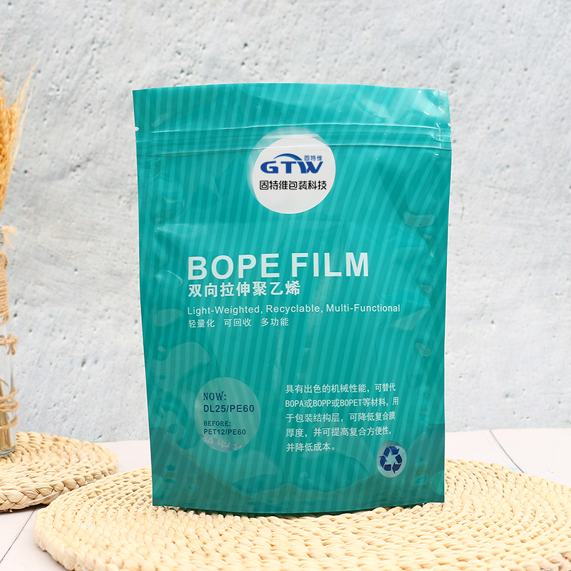 BOPE薄膜可单独使用或用于复合膜(如:BOPET // BOPE),制成易于撕